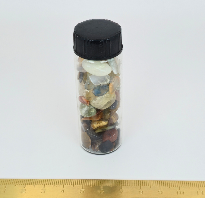 This vial contains a small assortment of tumbled stones, representing multiple rock and mineral types that have been mechanically rounded and smoothed. Tumbling mimics natural abrasion processes such as fluvial transport or coastal wave action, producing rounded forms with softened edges and enhanced surface polish.